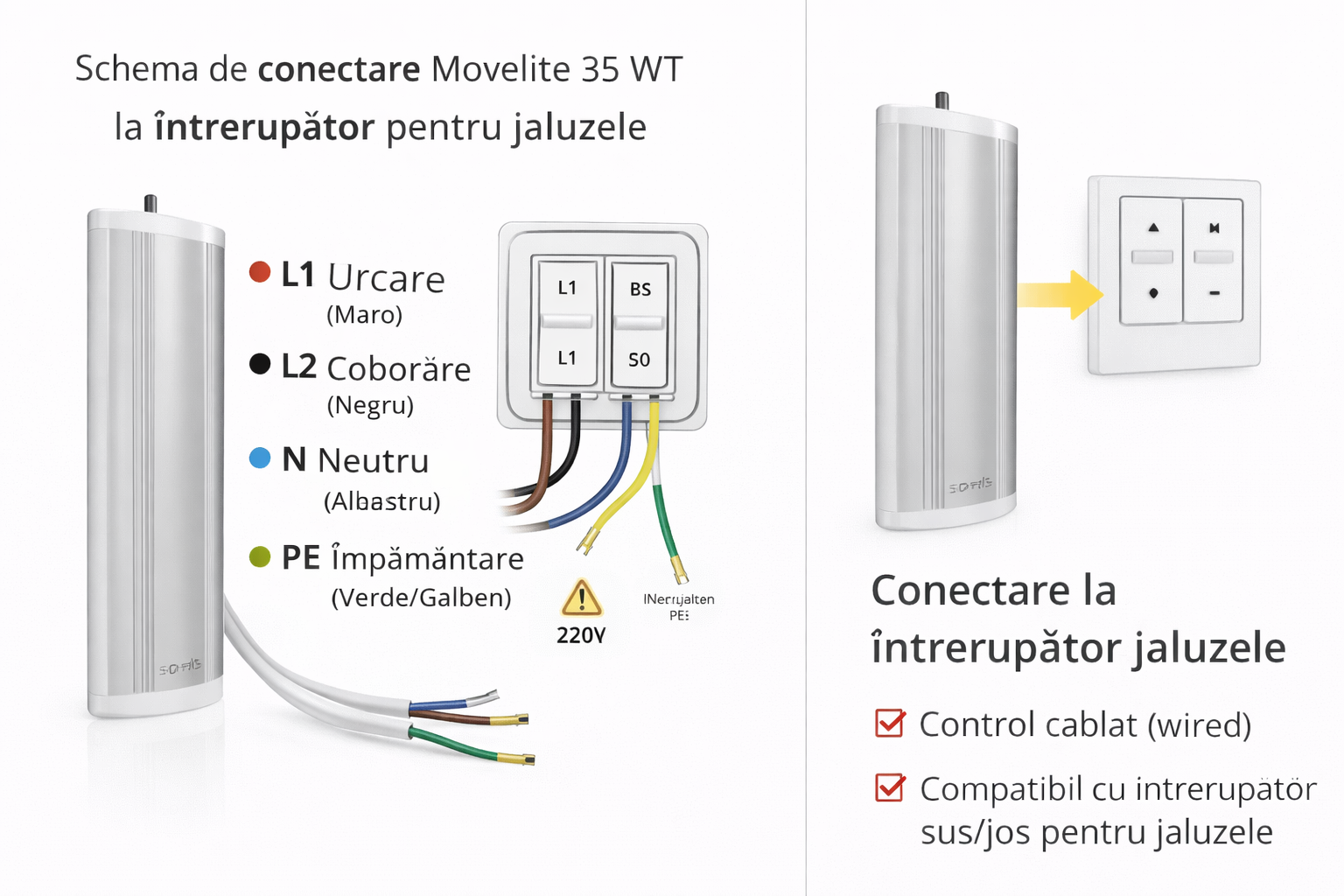 Dacă dorești o soluție stabilă, fără telecomandă sau conexiune radio, Movelite 35 WT este alegerea ideală. Oferă control simplu, fiabilitate și integrare ușoară în instalațiile electrice existente.