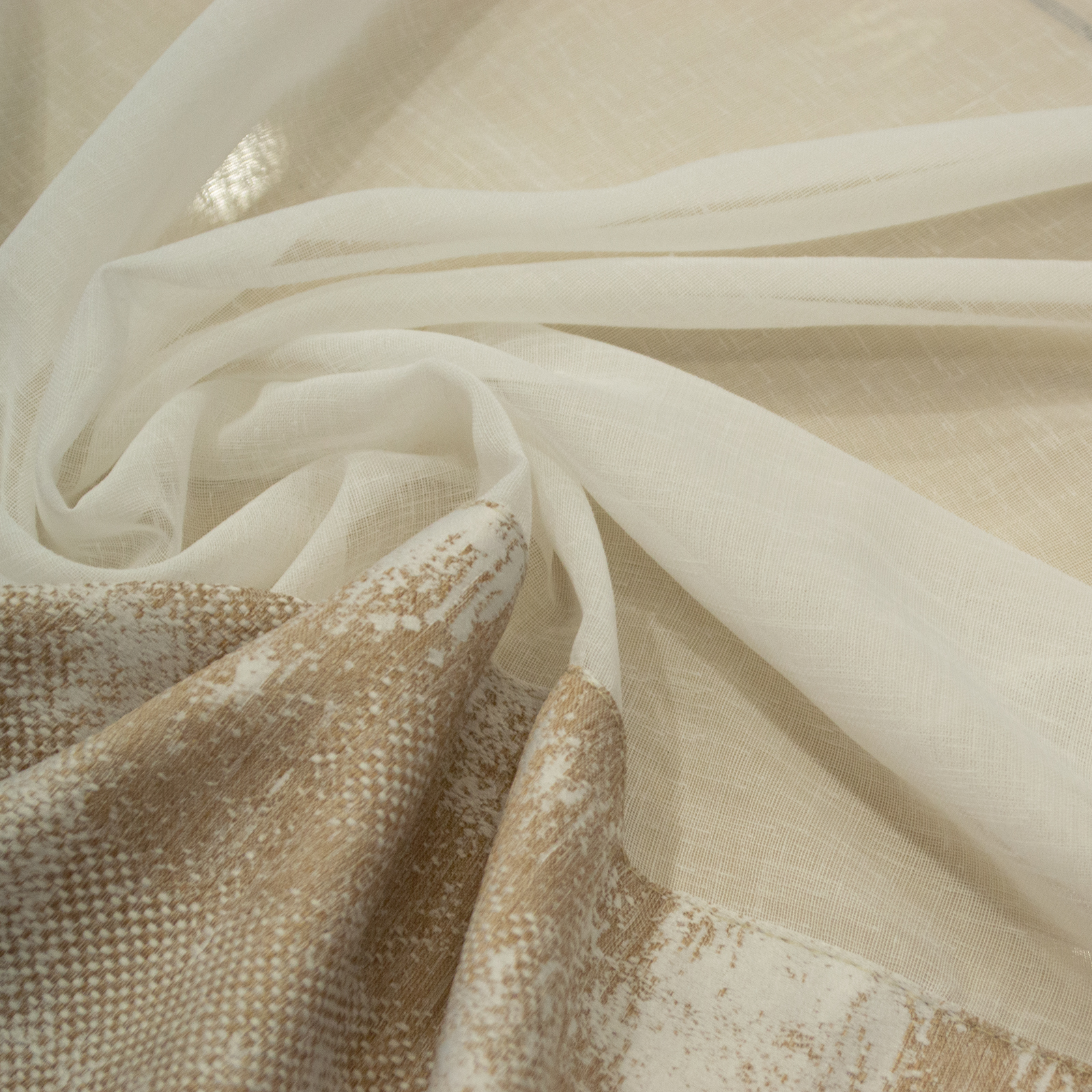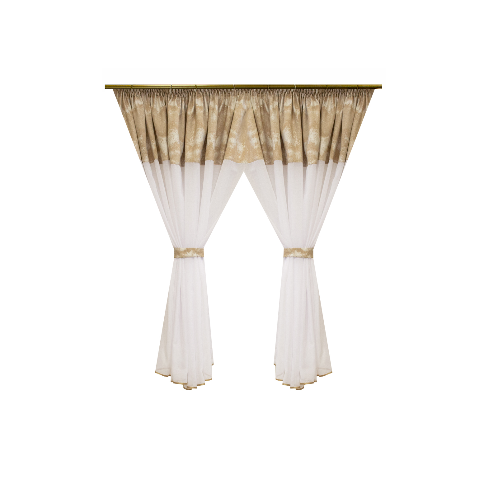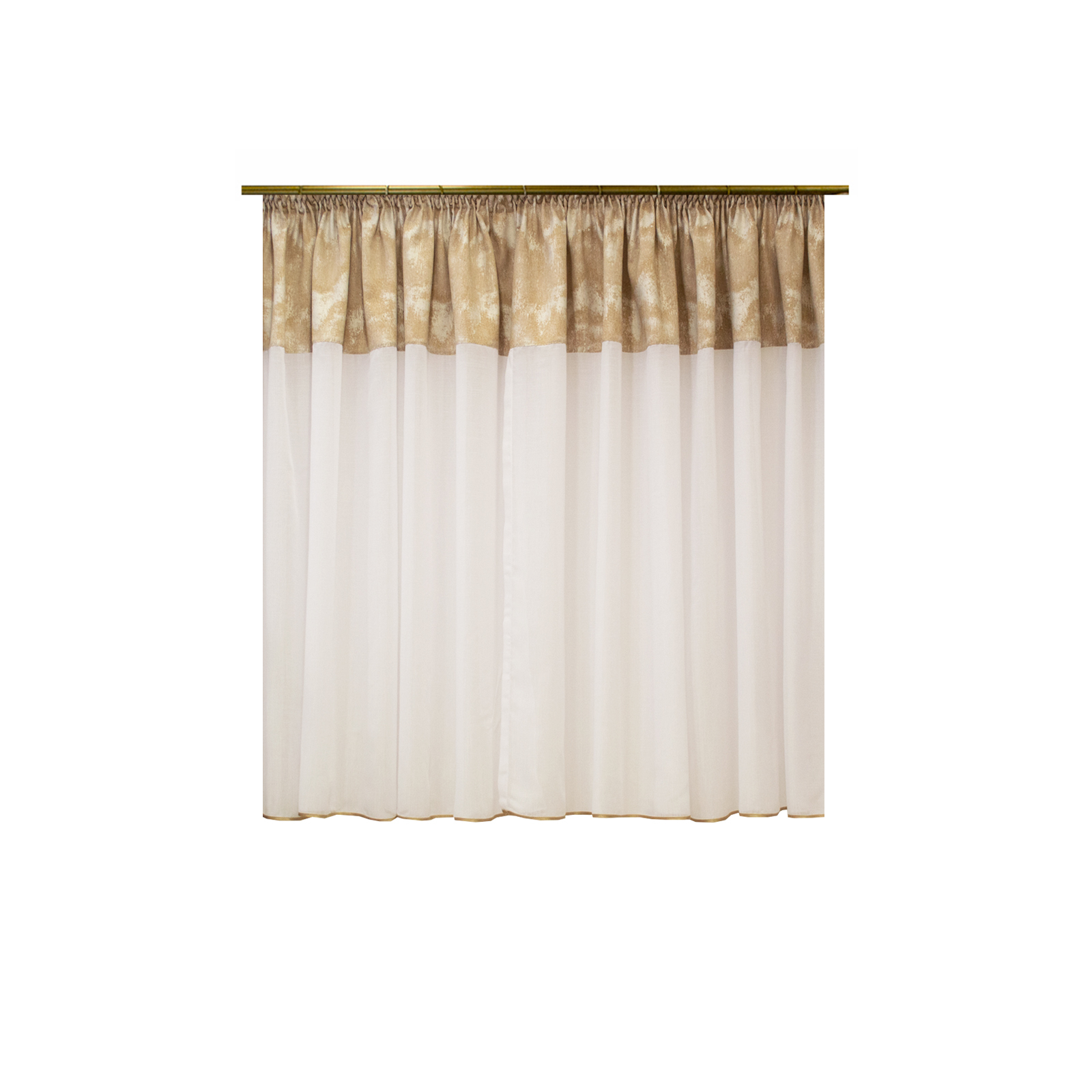 Perdeluta de bucatarie ivoire cu textura de in, confectionata cu rejansa lata de 6 cm, permitand prinderea atat pe sina de tavan cat si pe galerie cu inele.