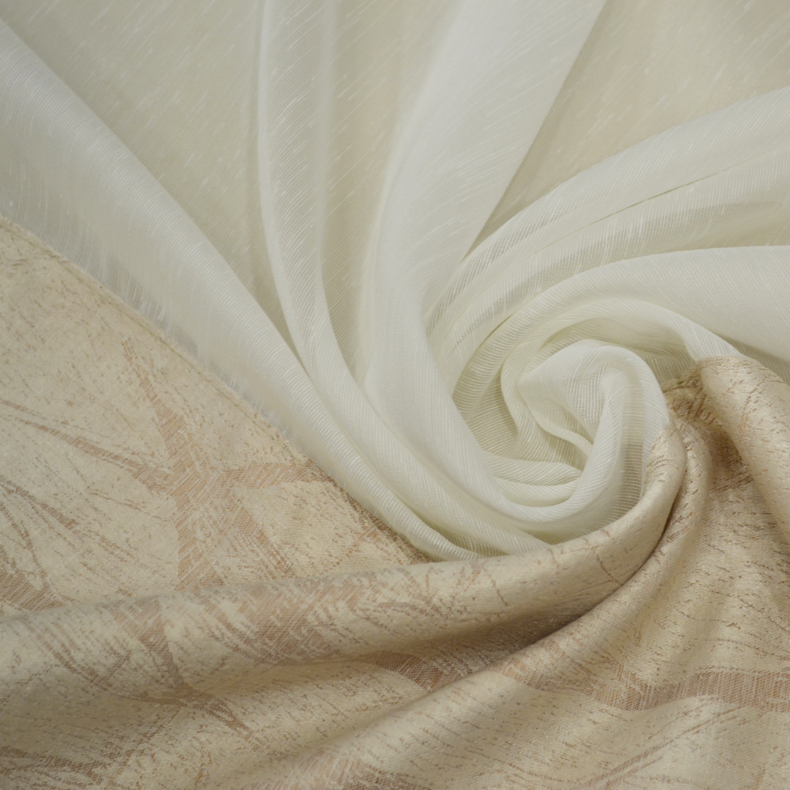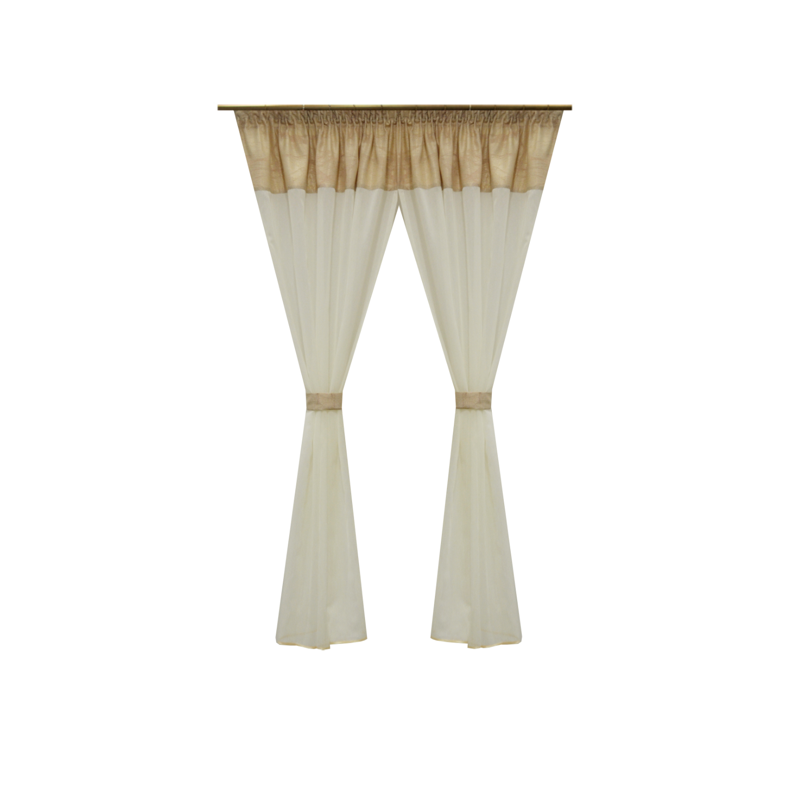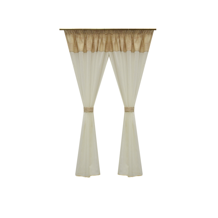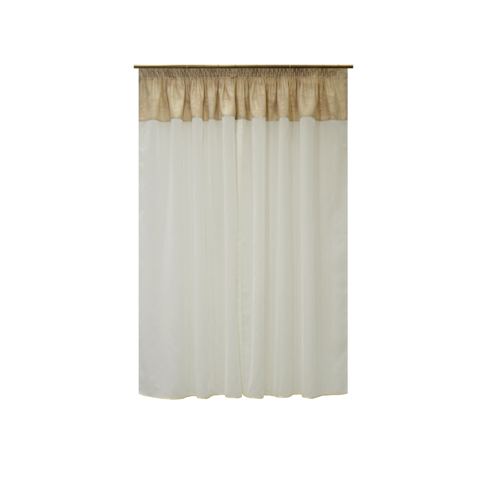 Perdeluta de bucatarie ivoire cu textura de tull, confectionata cu rejansa lata de 6 cm, permitand prinderea atat pe sina de tavan cat si pe galerie cu inele.