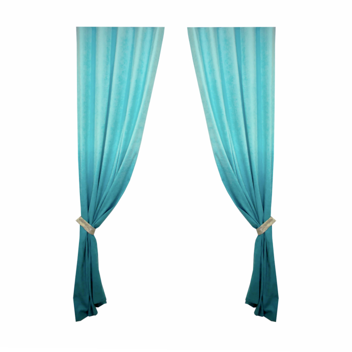 Set draperii din 2 bucati egale din material turcoaz degrade, confectionate pe rejansa profesionala lata care permite prinderea pe sina de tavan sau galerie cu inele.