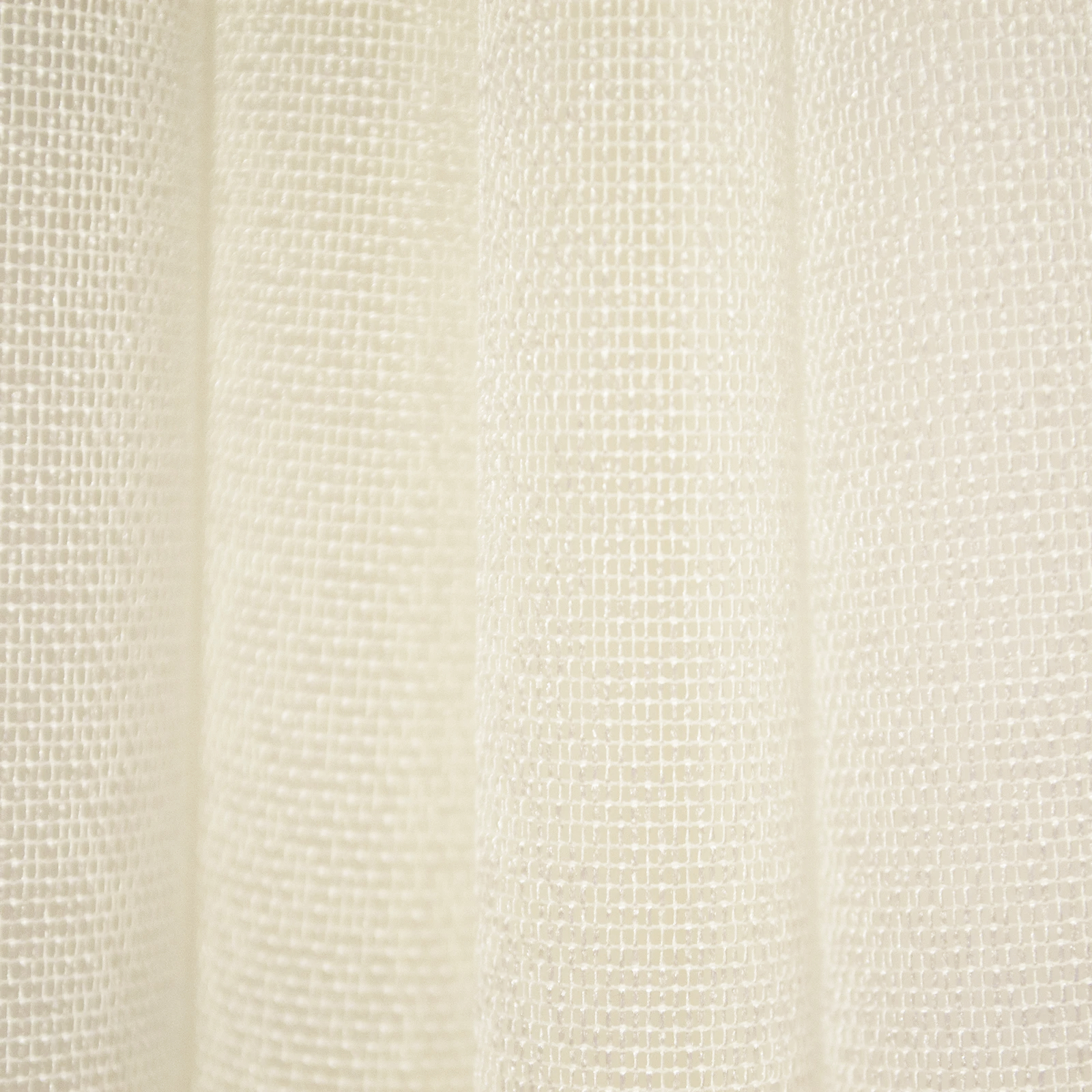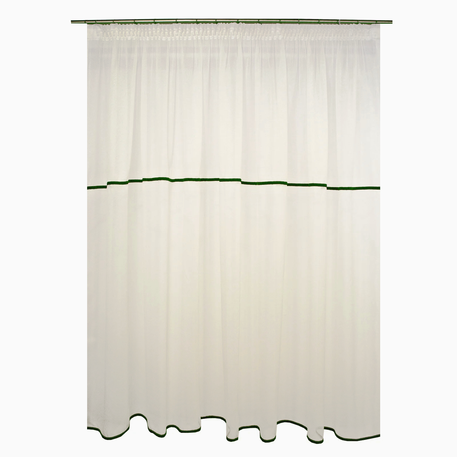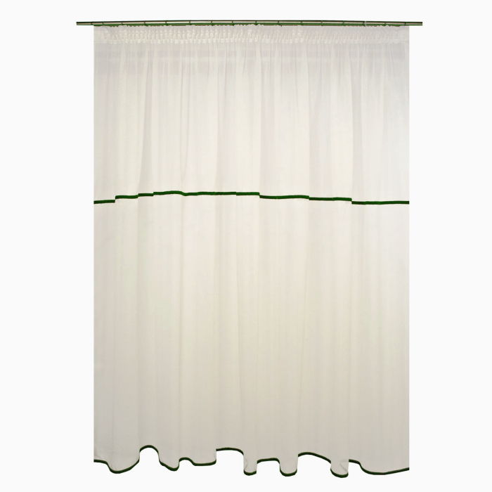 Perdea ivoire, subtire, lucioasa cu fir decorativ verde la baza. Este o perdea scurta confectionata cu rejansa de 6 cm ce poate fi agatata atat pe sina de tavan cat si pe galerie cu inele.