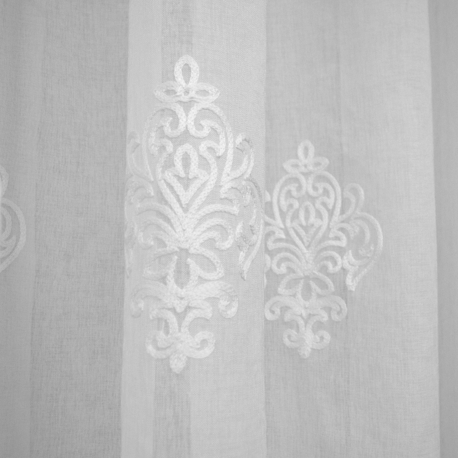 Perdea Velaria in ivoire cu model baroc brodat, confectionata cu rejansa care permite prinderea pe sina de tavan si galerie cu inele.