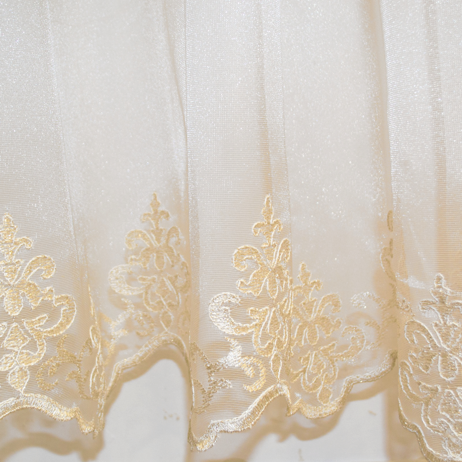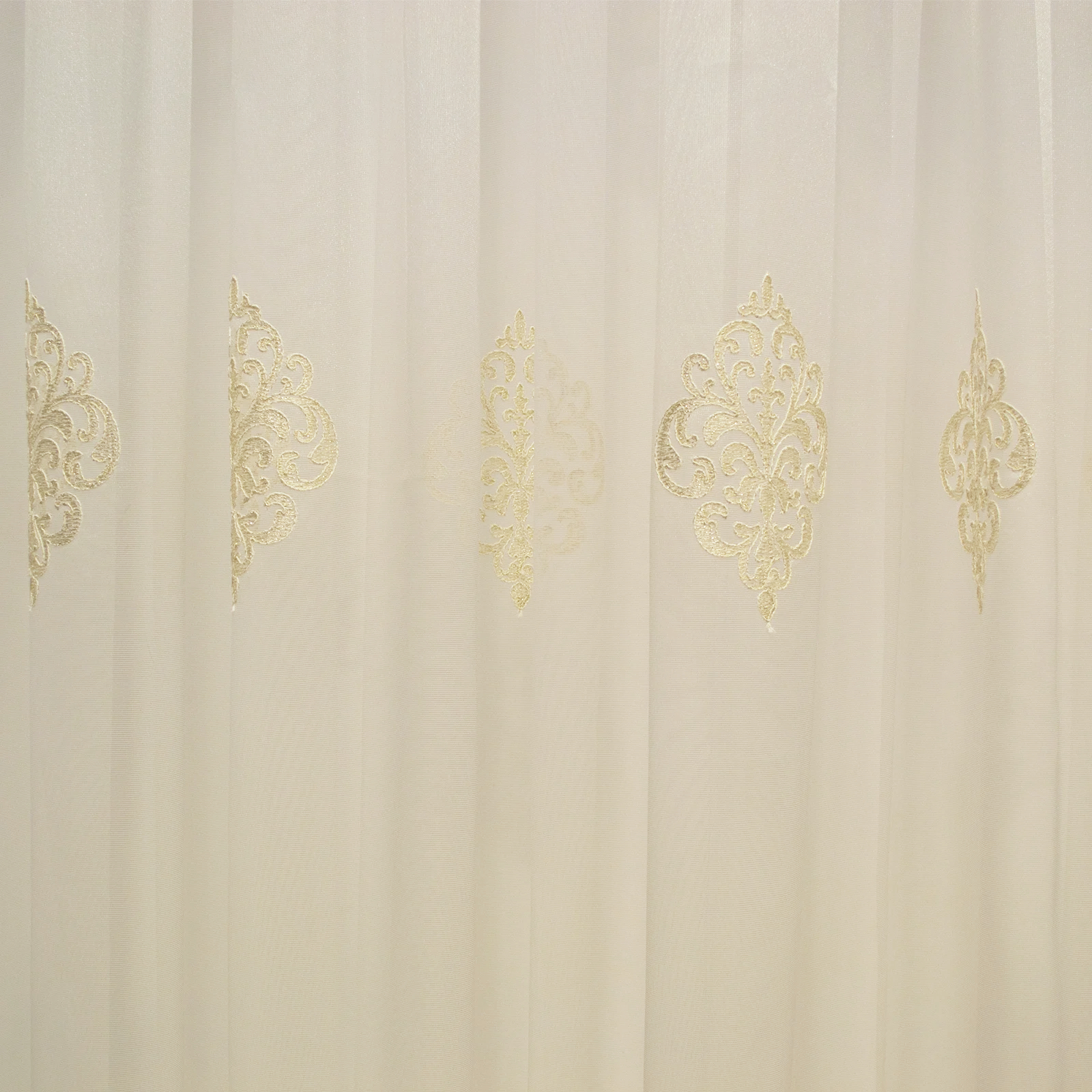 Perdea cu rejansa care permite prinderea atat pe sina de tavan cat si pe galerie cu inele. Este un tiul rezistent cu broderie model baroc in relief.