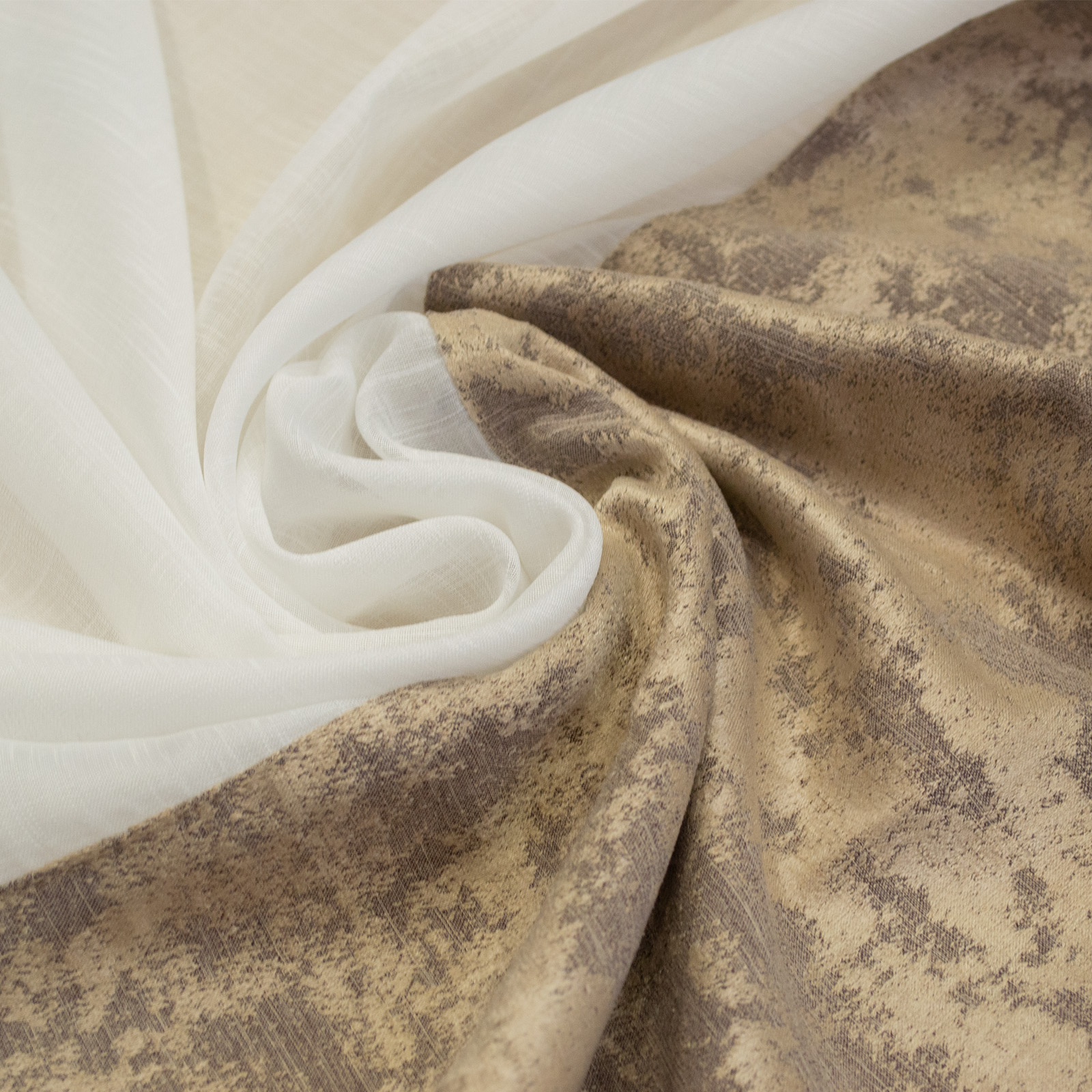 Este confectionata din 2 bucati egale, unite la mijloc in partea de sus, putand fi folosita atat pentru a acoperi tot geamul pentru a creea intimitate sau legata cu esarfe lateral pentru un plus de lumina si un design inedit.