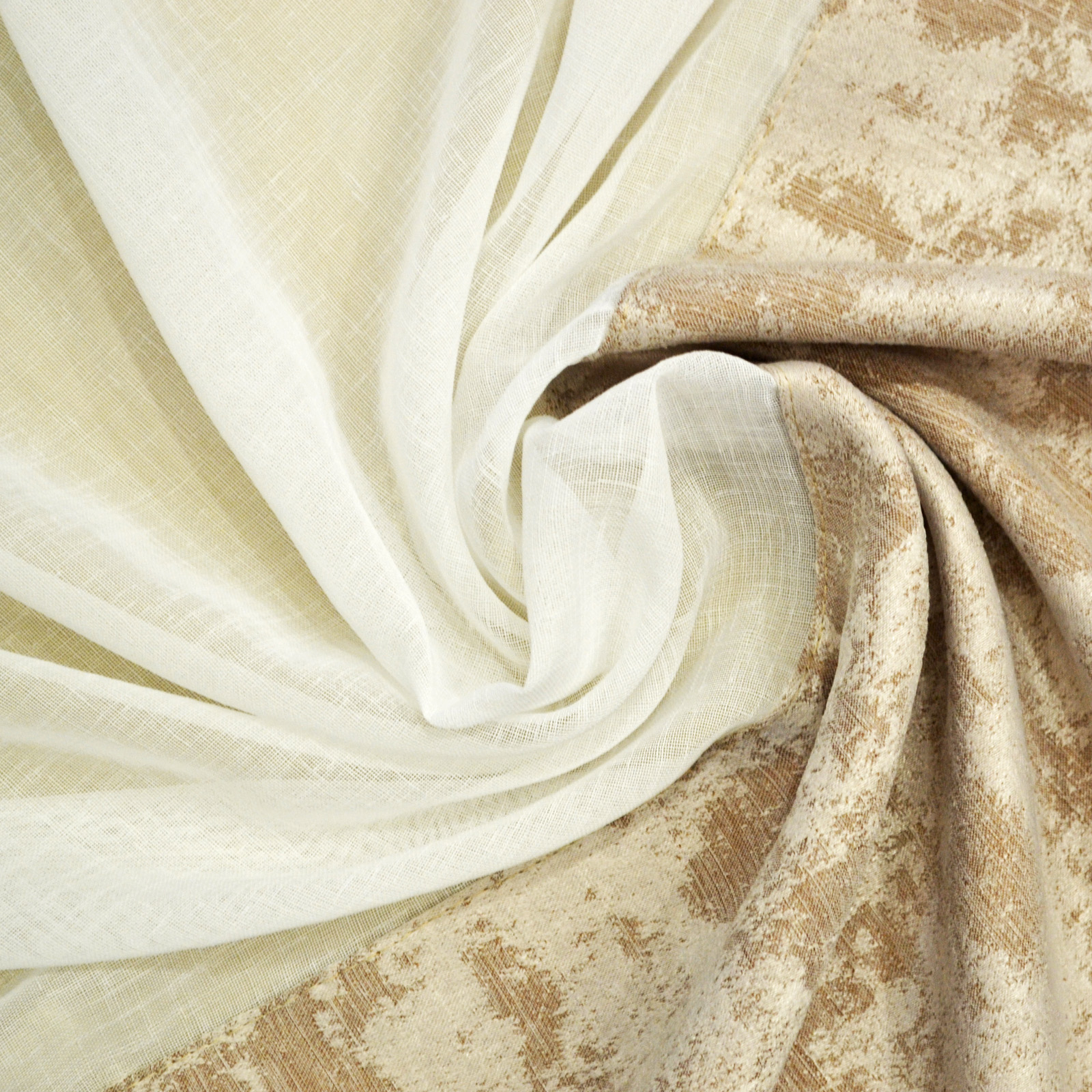 Este confectionata din 2 bucati egale, unite la mijloc in partea de sus, putand fi folosita atat pentru a acoperi tot geamul pentru a creea intimitate sau legata cu esarfe lateral pentru un plus de lumina si un design inedit.