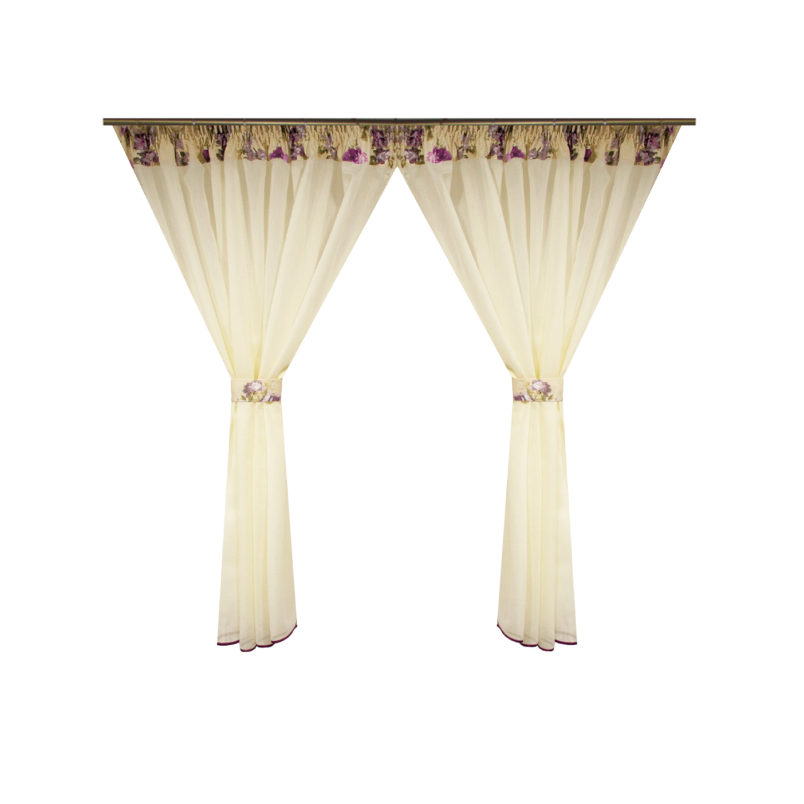 Perdeluta de bucatarie din bumbac fin ivoire cu imprimeu floral. Perdeaua este confectionata cu rejansa lata de 6 cm, permitand prinderea atat pe sina de tavan cat si pe galerie cu inele.
