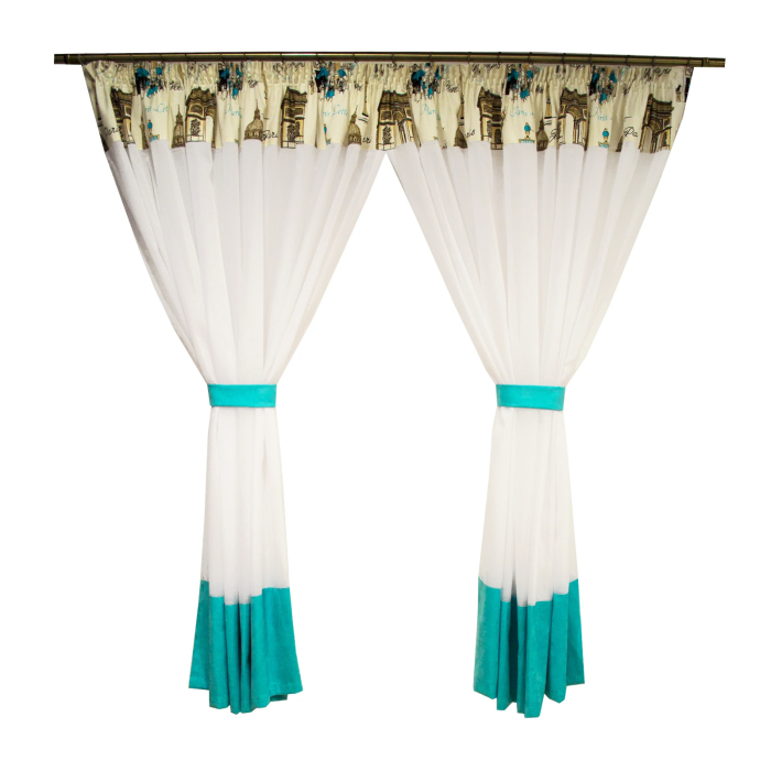 Perdeluta de bucatarie sau pentru balcon cu imprimeu motive urbane in partea de sus. Perdeaua este confectionata cu rejansa lata de 6 cm, permitand prinderea atat pe sina de tavan cat si pe galerie cu inele.
