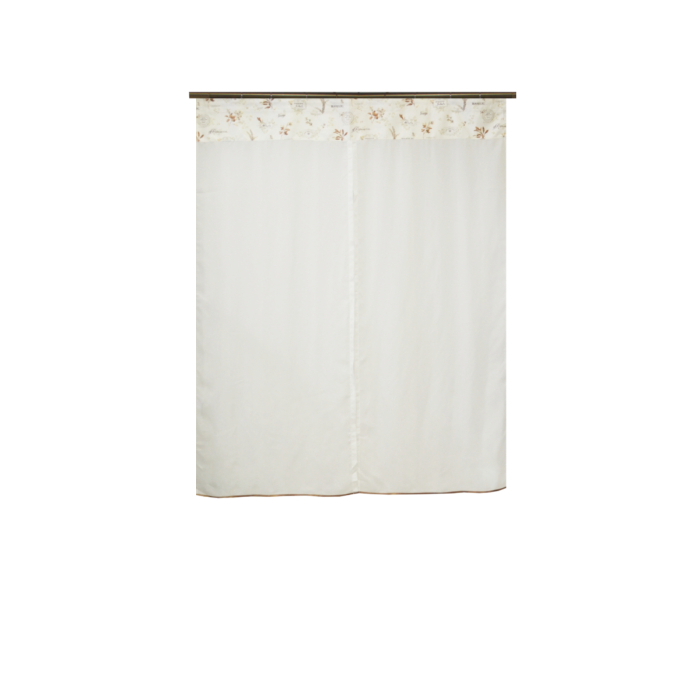 Perdeluta ivoire, textura in, de bucatarie confectionata cu rejansa lata de 6 cm, permitand prinderea atat pe sina de tavan cat si pe galerie cu inele.