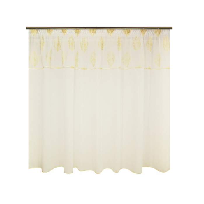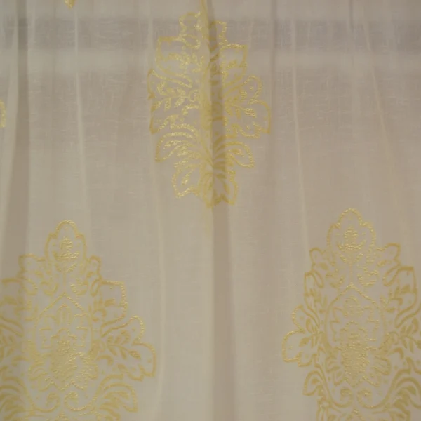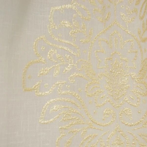 Perdea Velaria cu imprimeu baroc in partea superioara. Este confectionata din in de culoare unt si are aplicata rejansa profesionala care permite prinderea atat pe sina de tavan cat si pe galerie cu inele.
