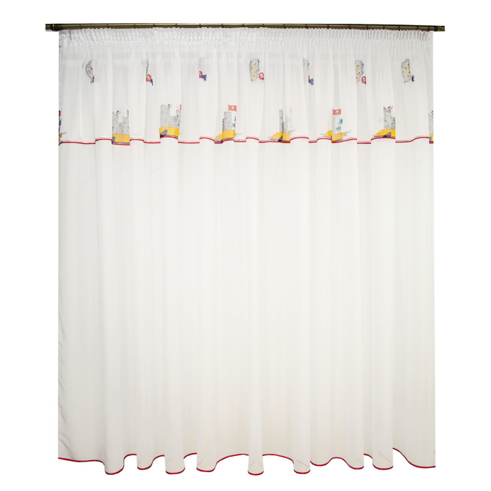 Perdea Velaria din voal alb cu motive din desene animate cu pirati in partea superioara. Are aplicata rejansa profesionala care permite prinderea atat pe sina de tavan cat si pe galerie cu inele.