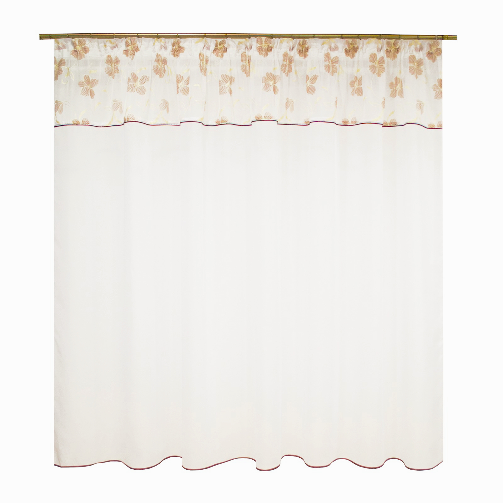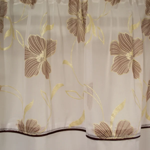 Perdea Velaria din voal alb cu flori pictate maro. Are aplicata rejansa profesionala care permite prinderea atat pe sina de tavan cat si pe galerie cu inele.