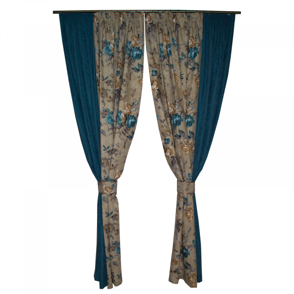 Draperiile sunt confectionate din in cu imprimeu floral in nuante de turcoaz. Pot fi agatate cu partea turcoaz uni la mijloc sau lateral, permitandu-va sa schimbati designul ferestrei foarte usor.